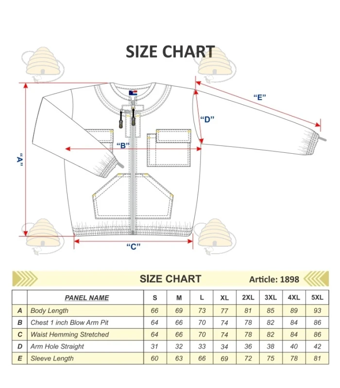 Blouson d'apiculteur avec voile anglais, en coton tissé serré. Cette veste d'apiculteur, très facile à enfiler, comporte six poches utilitaires : 2 à la taille, 2 sur la poitrine et 1 sur chaque manche. De plus, la veste est dotée de deux fermetures éclair (très solides, de la marque YKK) : une sur le devant de la veste et l'autre sur la capuche. Elles sont dotées d'un tissu qui se chevauche et d'un velcro à l'extrémité qui vous protège contre l’intrusion des abeilles. La capuche offre également une protection solaire partielle.
