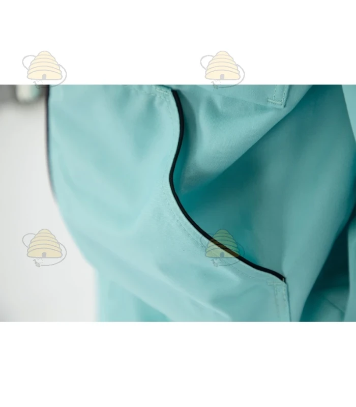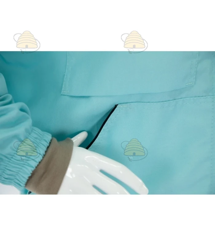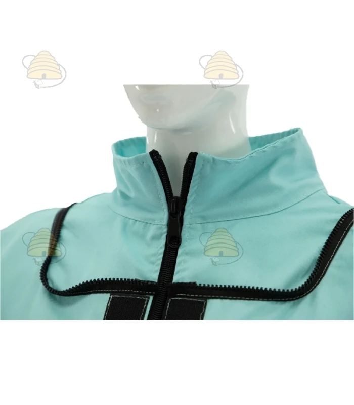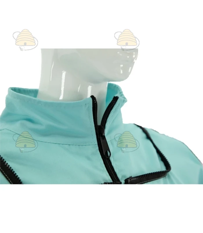 La veste est turquoise et dispose d’un voile rond et de poignets élastiqués. Une veste apicole durable, confectionnée dans un tissu respirant.