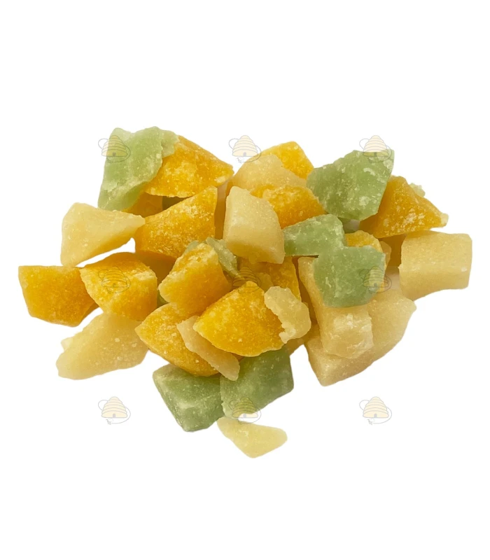 Délicieux mélange de bonbons au miel aux arômes d'eucalyptus, de menthol et d'anis. La pâte de miel est une confiserie ancienne du Moyen Âge. À l'époque, le bonbon au miel était utilisé comme médicament pour toutes sortes de maux, tels que les rhumes, les maux de gorge et les laryngites. De nos jours, le bonbon au miel est principalement considéré comme une délicieuse confiserie naturelle. Le bonbon au miel est fabriqué de manière traditionnelle à partir de miel pur d'apiculteurs locaux, de colorants 100% naturels, d'aromates, d'huiles, de fruits ou d'arômes naturels.