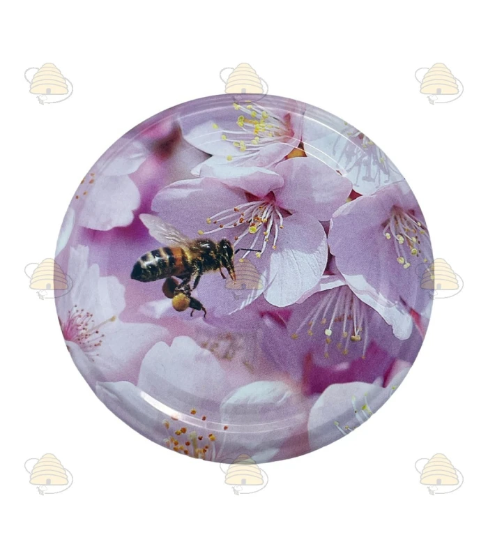 Couvercles avec une jolie image d'abeille qui butine une fleur rose. Les couvercles sont vendus par 12 et conviennent aux pots de taille TO 82 mm.