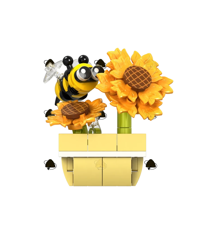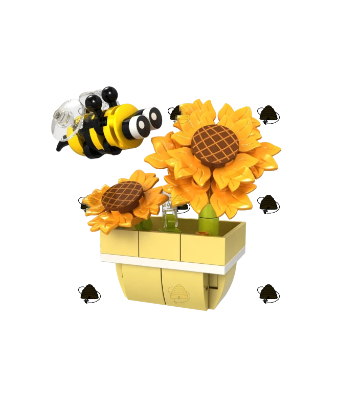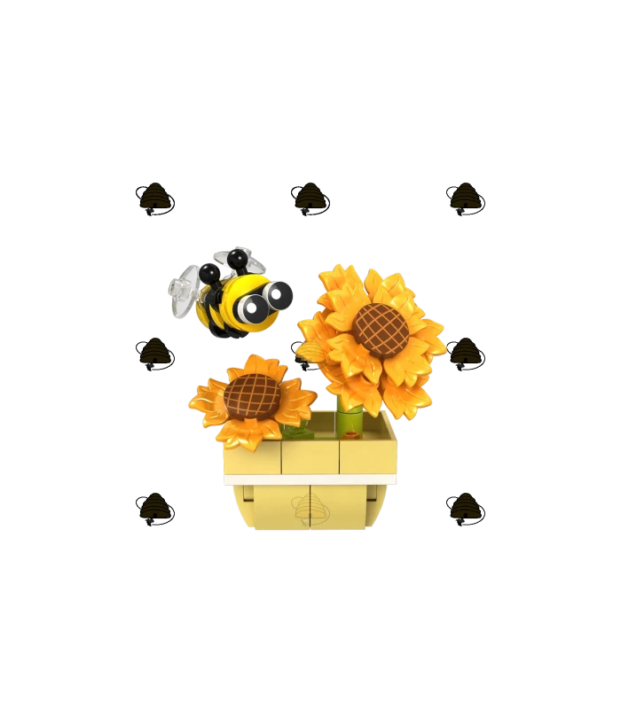 Kit de construction pour réaliser une petite abeille sur des tournesols. Ce kit comprend 85 briques de construction et est très amusant pour les plus jeunes apiculteurs et apicultrices parmi nous !