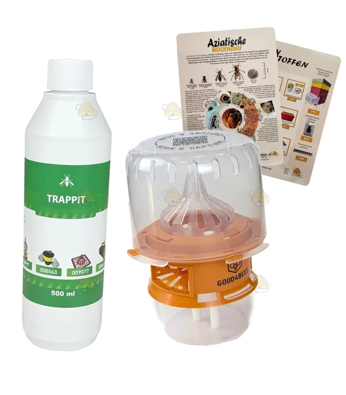 Ce paquet comprend un piège sélectif à frelon asiatique de la marque Good4Bees, 0,5 litre d’attractif Trappit et une fiche d’information sur le frelon asiatique