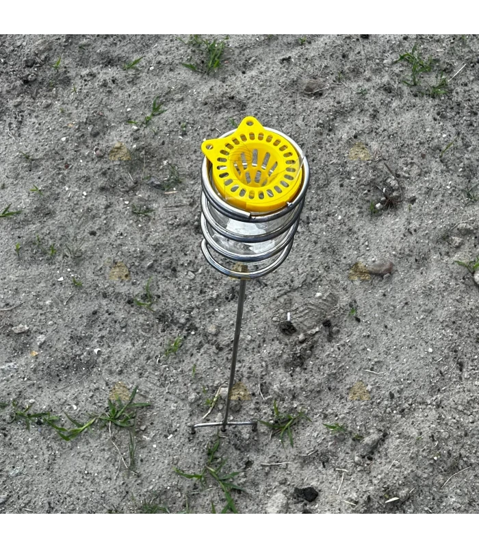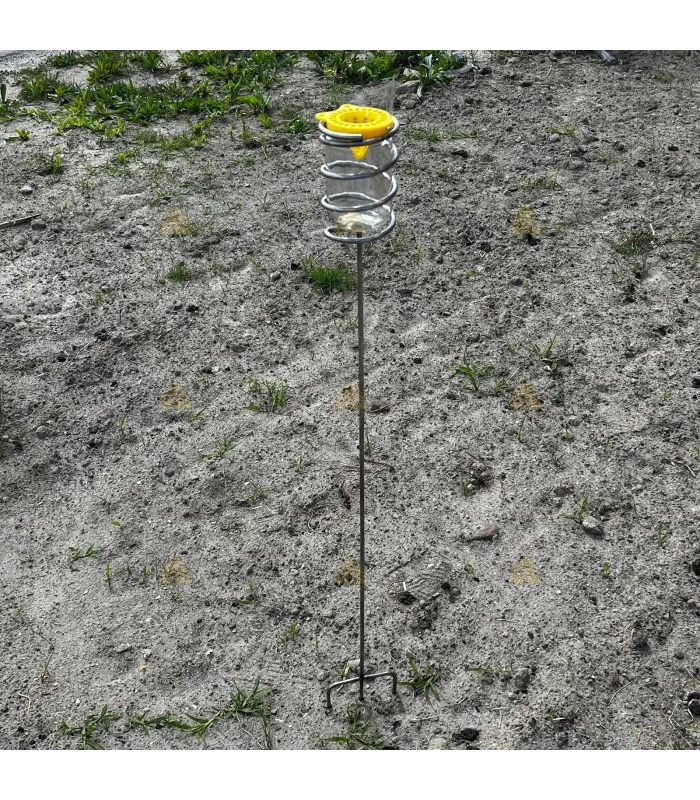 Support ou porte-piège en acier inoxydable, spécialement conçu pour les pièges à frelons asiatiques avec un pot en verre, utilisables aussi bien en position horizontale que verticale. Ce support est également très pratique pour l’utilisation de pots en verre avec du liquide attractif afin de repérer et localiser les nids de frelons asiatiques. Il suffit de planter le support dans le sol et d’insérer le pot en verre dans la partie en spirale. Le pot se retrouve ainsi placé à la hauteur idéale pour une capture optimale des frelons.