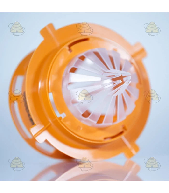 Sur le côté du piège, le frelon est guidé vers l'intérieur. Dès qu'il pénètre dans le piège, il est automatiquement attiré par la lumière qui entre par la partie supérieure transparente. Par l'entonnoir conique, il rejoint le compartiment supérieur du piège.