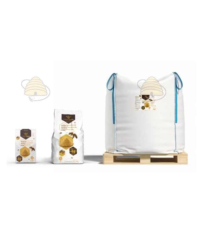 MegaBee est une poudre de protéines et de vitamines conditionnée dans un sac de 20 kg.