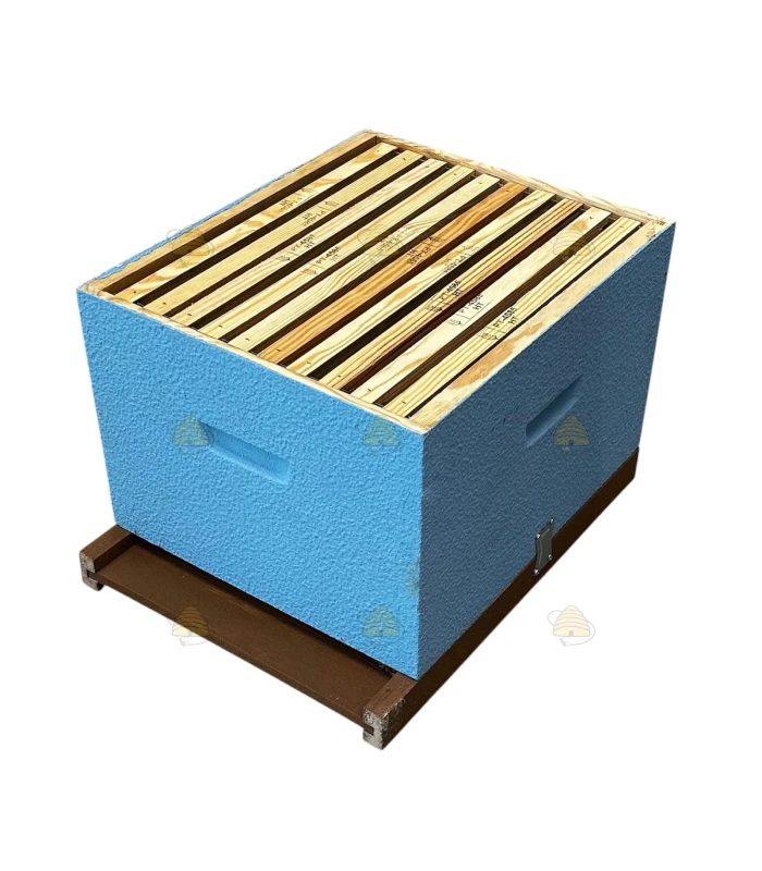 Ruche Dadant Blatt en bois de pin, prête à l’emploi, livrée complète et déjà peinte en bleu ciel.