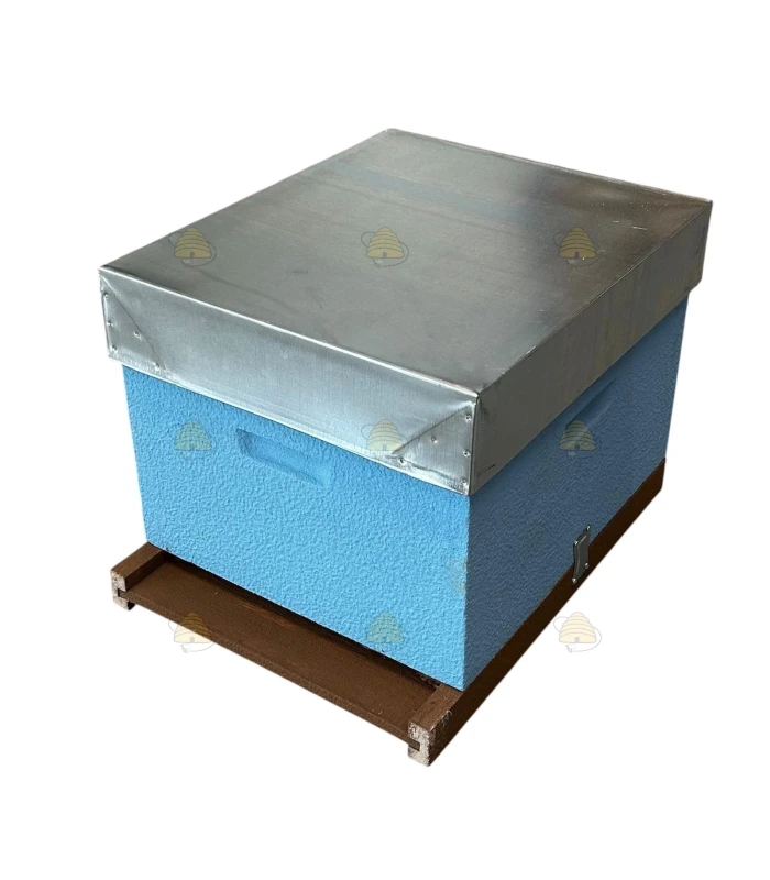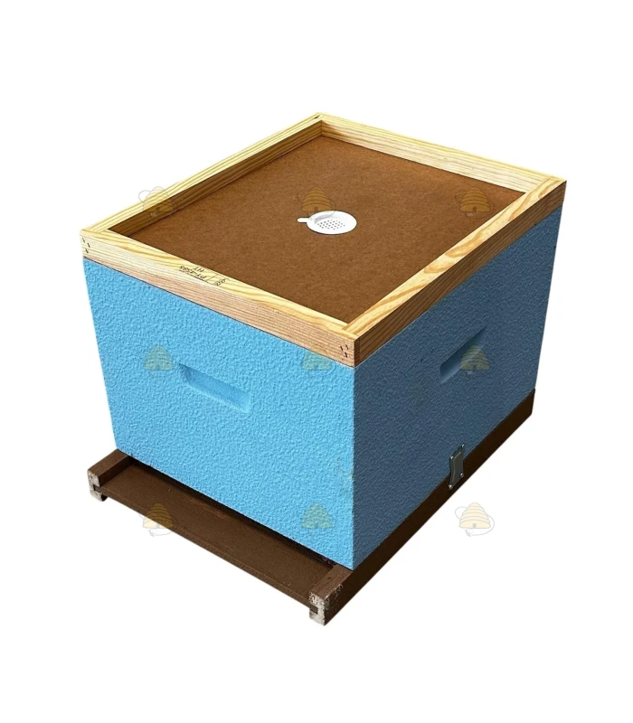Le plancher est peint en brun et le corps en bleu ciel. Les cadres de la ruche sont pourvus d’une rainure, mais peuvent bien entendu aussi s’utiliser sans rainure. Grâce aux crémaillères et au porte-cadres au bas du corps, les cadres restent bien en place. Le plancher et le corps sont fixés l’un à l’autre sur le côté.