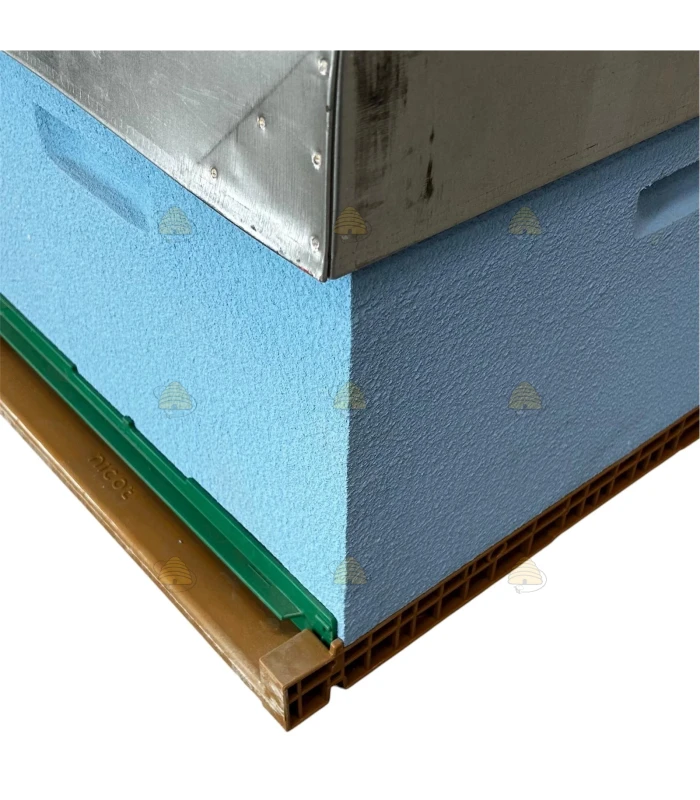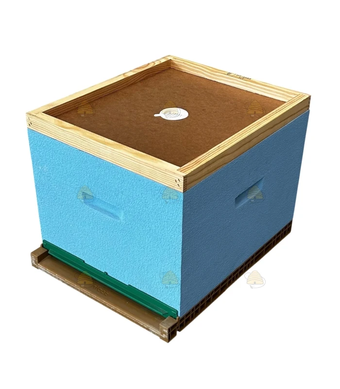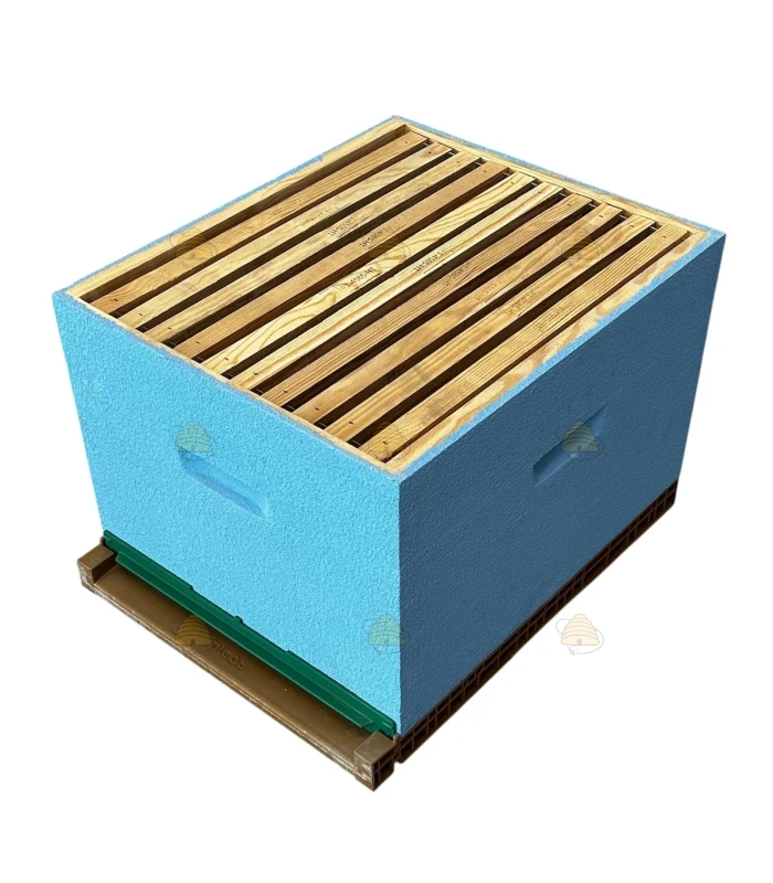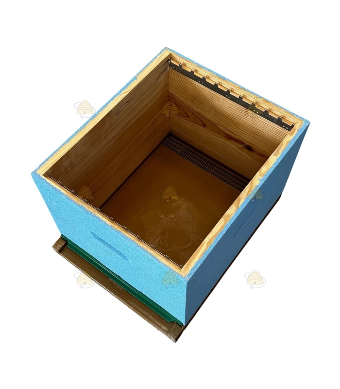 Le corps est peint en bleu ciel. Les cadres de la ruche sont rainurés, mais peuvent évidemment aussi s’utiliser sans rainure. Grâce aux bandes d’écartement et à la crémaillère au bas du corps, les cadres restent bien à leur place. Le plancher et le corps sont fixés l’un à l’autre par le bas.