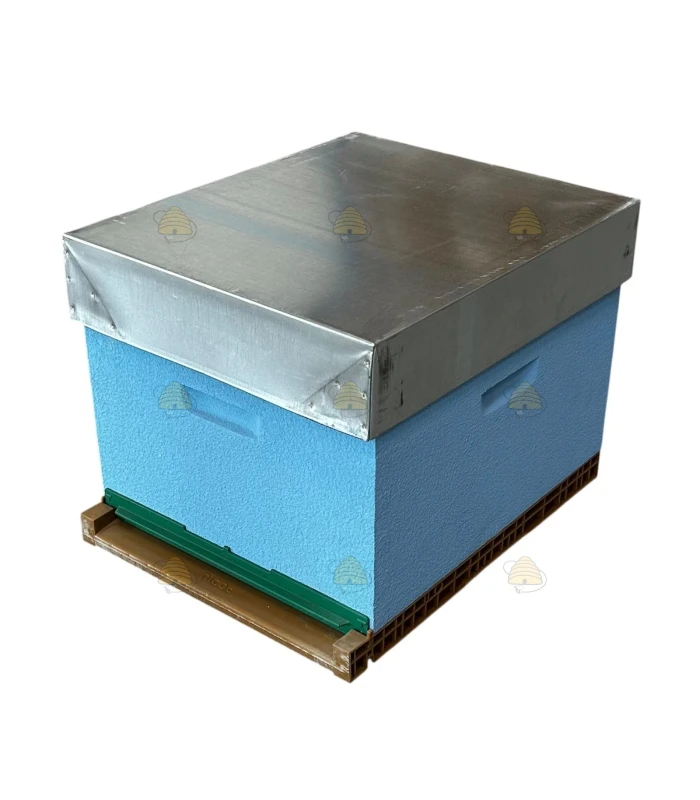 La ruche se compose d’un plancher Nicot, d’un corps 10 cadres, de 10 cadres, de bandes d’écartement, d’une crémaillère, d’un couvre-cadres, d’un toit et d’une porte d’entrée coulissante.