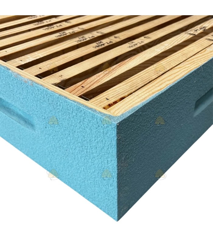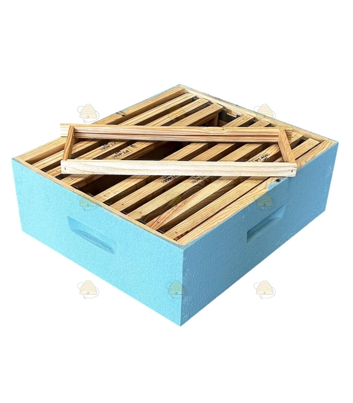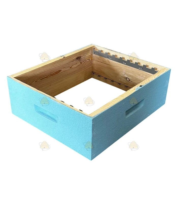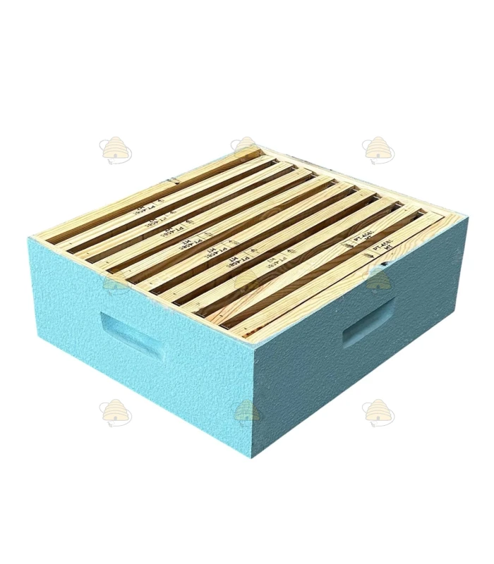 Cette hausse pour ruche Dadant Blatt est peinte en coloris bleu ciel et équipée de 9 cadres rainurés. Vous pouvez bien sûr utiliser des cadres sans rainure. La hausse est également équipée de bandes d’écartement et d’un porte-cadres, qui maintiennent les cadres bien en place.