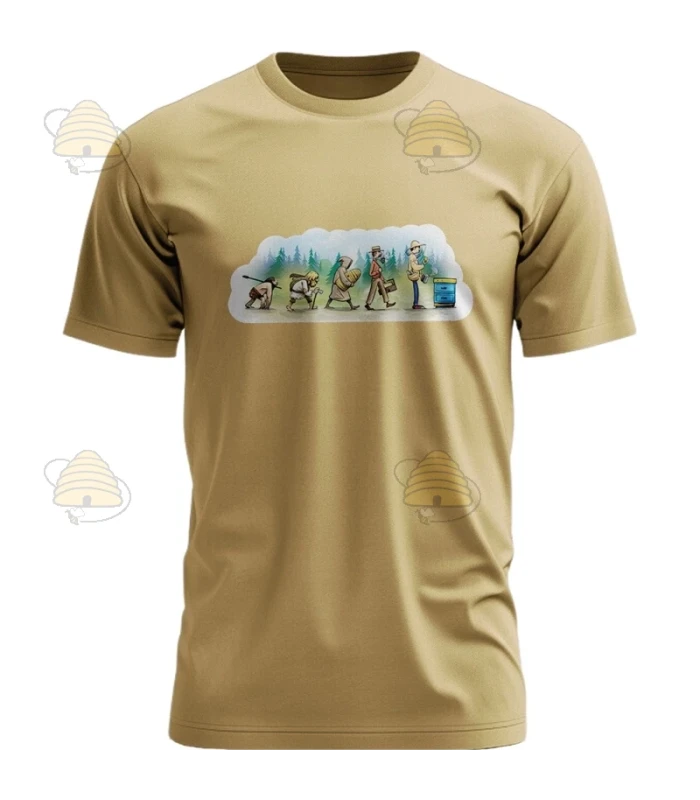 T-shirt beige avec illustration de l’évolution de l’apiculteur – du premier apiculteur primitif jusqu’à l’apiculteur moderne. Un hommage à la relation millénaire entre l’homme et l’abeille. Fabriqué en 100 % coton avec une impression de haute qualité, garantissant confort et durabilité.